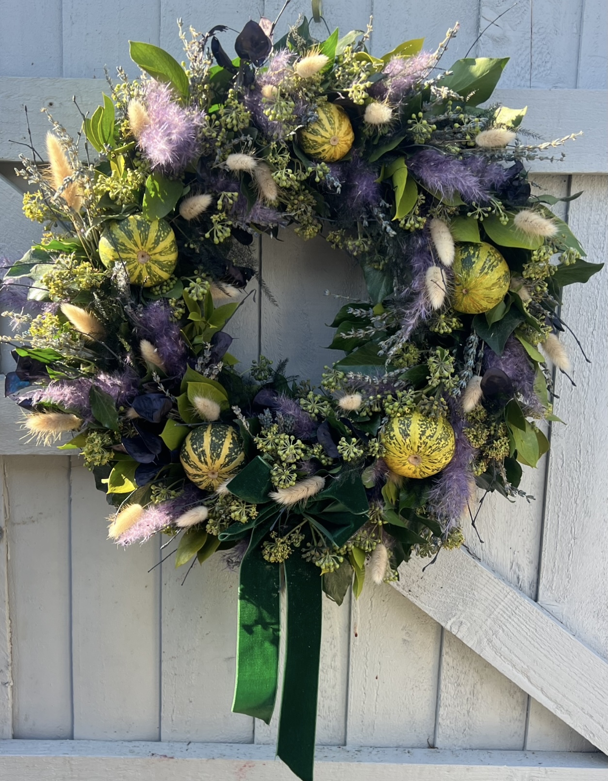Step into the magic of autumn with the Enchanted Forest wreath, a rich seasonal design inspired by woodland charm. Handcrafted with lush green foliage, soft purple accents, striped gourds, and textured grasses, this wreath captures the mystery and beauty of the forest in a truly unique way.
