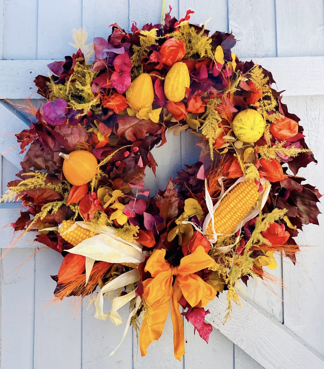 Celebrate the abundance of the season with the Golden Harvest wreath, a vibrant autumnal design full of warmth and character. Handcrafted with glowing yellow gourds, decorative corn, fiery foliage, and rustic textures, this wreath captures the golden beauty of harvest time in one striking display.